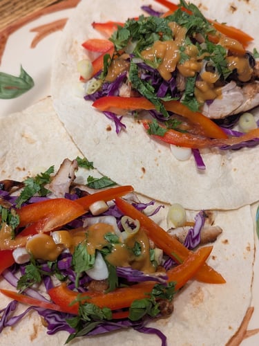 1 serving is two tacos with 5 oz of chicken, 37g of peanut sauce and the garnishes: 42g Protein, 38g Fiber, 536 Calories per serving (macros from the video adjusted just a teensy bit).