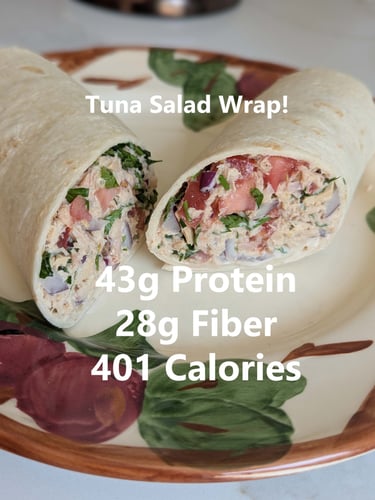 1 serving = 2 tbsp Tzatziki Sauce, 3 ounces of Chicken, 18g Feta Cheese, some sliced cucumber, sliced tomato, and sliced onion on 1 Mission Carb Balance tortilla: 36g Protein, 17g Fiber, 318 Calories per serving